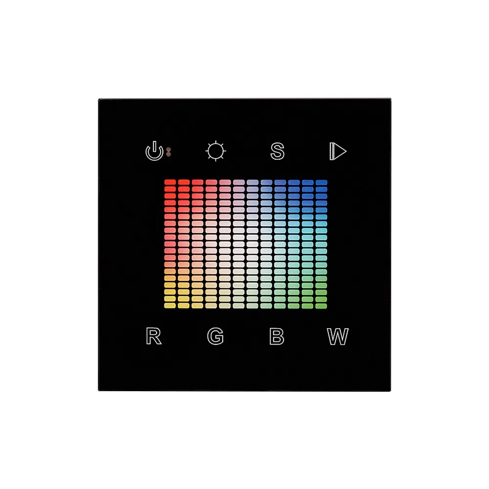 Встраиваемая стеклянная черная Touch-панель с уникальным сенсорным RGBW-квадратом, раздельная регулировка каналов (4 канала - R,G,B,W), 1 зона. Управление 1 зоной по радиоканалу контроллерами серии SR-1009. Питание 220 В. Размер 86x86x29 мм.