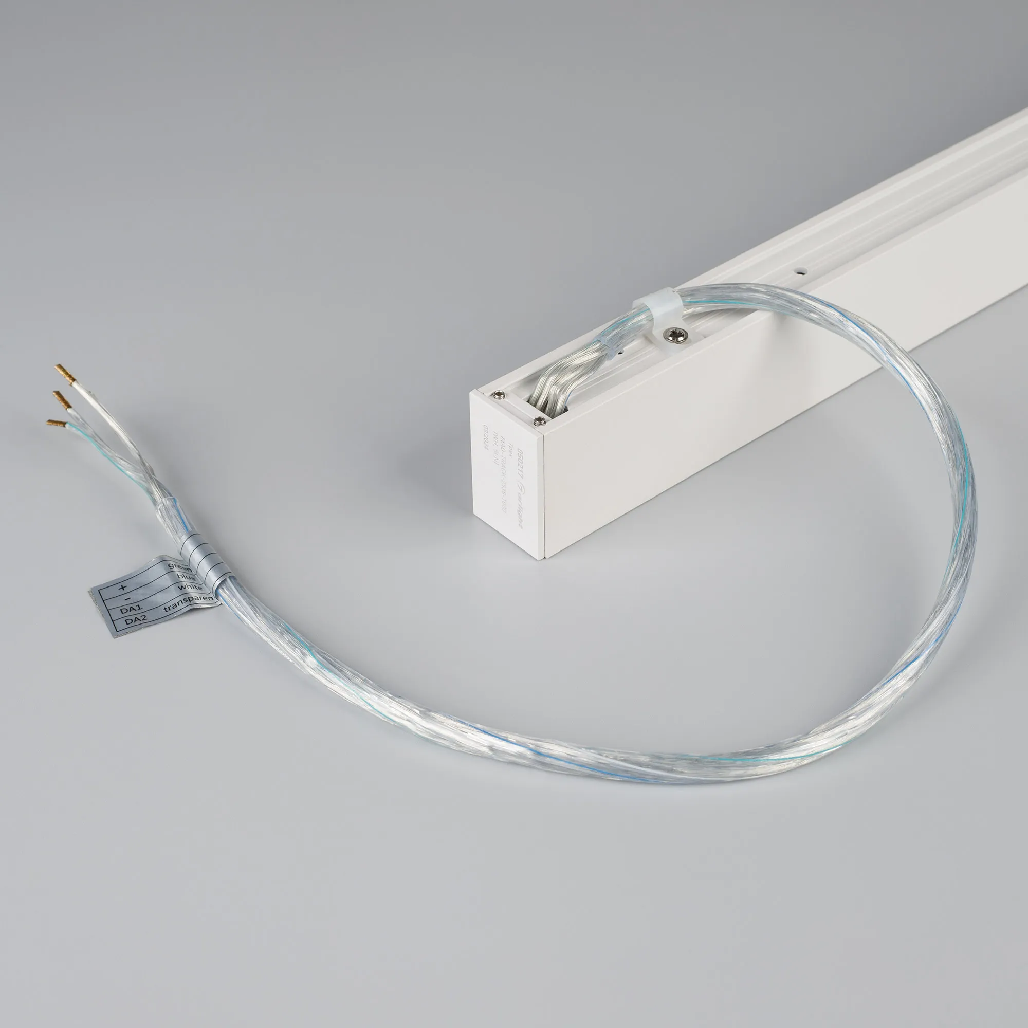 Подвесной, накладной магнитный трек, длина 3000 мм. DC24V, позволяет диммировать светильники по протоколу DALI. Материал алюминий, цвет белый. Две заглушки в комплекте. Размер ДxШxВ: 3003x25x38 мм. Размер (с учетом заглушек). Аксессуары для подвесного монтажа в комплект не входят. К плате идет провод 24В длиной 1м.